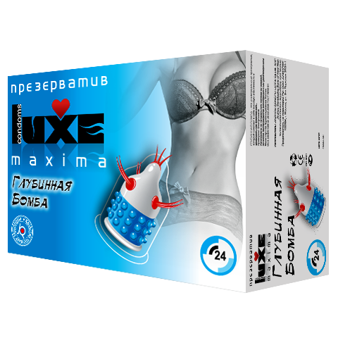 LUXE Maxima Глибинна бомба Опис: Презервативи сертифіковані. Безбарвні презервативи в мастилі з пухирцями і вусиками. У пачці 1 презерватив. У блоці 24 пачок. У коробі 30 блоків. Довжина: 180 мм, Ширина: 52 мм, Товщина стінки: 0,07 мм. Характеристики: Вид презерватива: Classic Текстура з вусиками і кульками